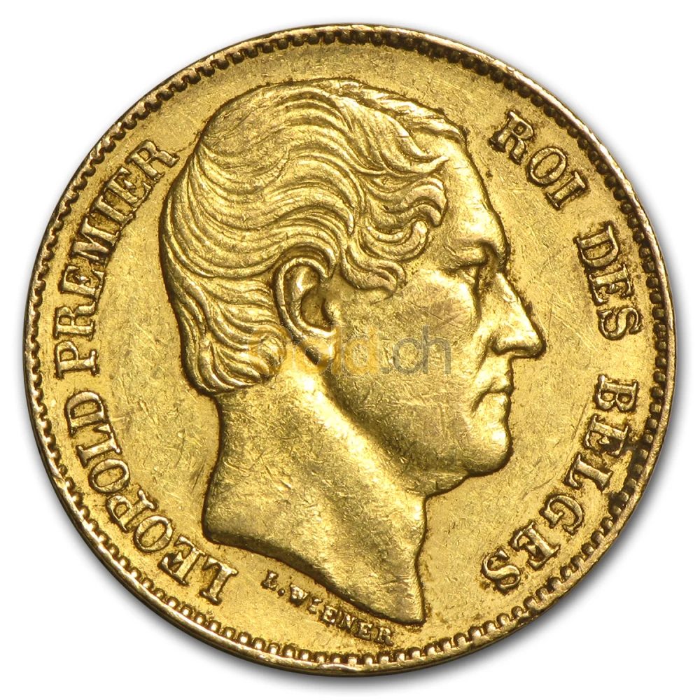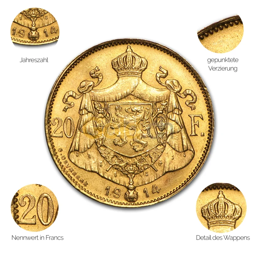 Der Belgische Franc war von 1832 bis zur Einführung des Euros 2002, das offizielle Zahlungsmittel in Belgien. Auf der Goldmünze sind die zur Zeit der Prägung herrschenden Monarchen zu sehen und die jeweiligen königlichen Wappen. Die Münze besteht aus einer Metalllegierung aus Gold und Kupfer. Sie weist einen Feingehalt von 900/100 (90 %) Gold und dementsprechend 10 % Kupfer auf. Das Feingewicht beträgt 5,81 g (Gold) und das Gesamtgewicht liegt bei 6,45 g. Auf der Wertseite ist den Nennwert von 20 Franc vermerkt. Der Belgische Franc ist eine historische Umlaufmünze, die durch die Legierung mit Kupfer zu einer robusten Anlagemünze zählt. Sie verbindet Geschichte und Wertanlage und eignet sich somit ideal für Sammler und Anleger.