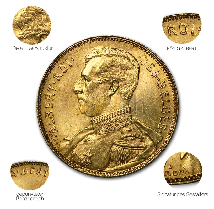 Die Goldmünze zeigt das Profil des herrschenden belgischen Königs Albert I. Er ist mit seiner Militäruniform bekleidet und blickt stolz nach links. An seinem Kragen sind florale Muster abgebildet und an seiner Brust trägt er ein Emblem Belgiens. Links neben ihm verläuft am Rand der Münze „ALBERT ROI“ und am rechten Rand steht „DES BELGES“. Am Rande des Münzgrunds verläuft eine Punktefolge. Zusätzlich zur französischen Inschrift wurde auch eine Version in Niederländisch geprägt. Dort lautet die Inschrift "ALBERT KONING DER BELGEN".