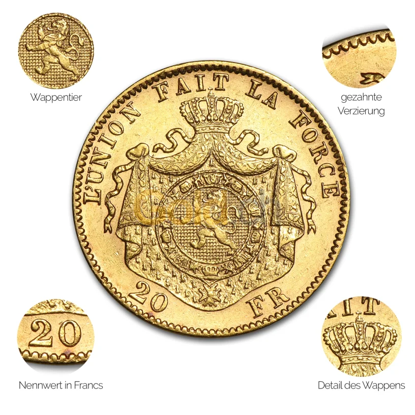 Auf der Rückseite der ersten 20 Francs-Goldmünze schmückt ein aus Eichenzweigen und -blättern geflochtener Eichenkranz den Münzgrund. Das Symbol der Eiche spielt in vielen Nationen eine große Rolle: Es steht als politisches Symbol für souveräne Macht und Treue. Schon in der Antike fand das Eichenblatt Verwendung als Randdekoration von Münzen. Auch am Rande der ersten 20-Franc-Goldmünze findet sich das traditionsreiche Symbol wieder. Das belgische Wappen wurde ab 1867 auf die Rückseite der 20-Franc-Münze geprägt. In der Mitte des Wappens befindet sich das Schild mit einem aufrechten Löwen, der nach links blickt. Das Schild steht vor einem Wappenzelt, auf dessen Spitze die Krone zu sehen ist. Der Stoff des Zelts wird von zwei Schleifen auf beiden Seiten gehalten. Hinter dem Schild befinden sich zwei gekreuzte Zepter. Unter dem Schild hängt der Löwenorden, ein Verdienstorden, der durch Leopold II. ins Leben gerufen wurde.