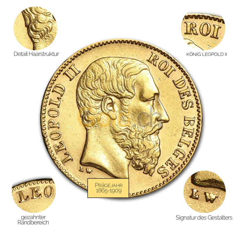Die Goldmünze zeigt das Profil des damals herrschenden belgischen Königs Leopold II.: „LEOPOLD II“ verläuft entlang des linken Rands der Münze und auf der anderen Seite steht „ROI DES BELGES“. In der Mitte der Münze ist die rechte Seite des Profils von König Leopold II. zu sehen. Unter dem Porträt befindet sich die Jahreszahl der Prägung.