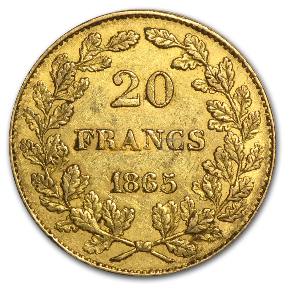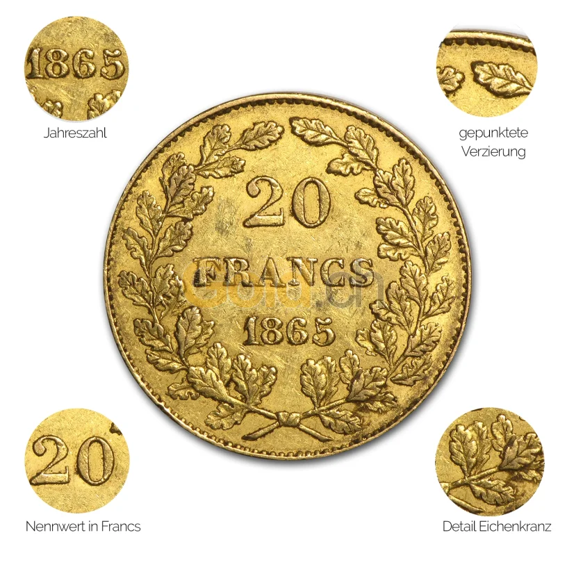 Auf der Vorderseite der goldenen Franc-Goldmünze steht der Nennwert „20 Francs“ und die Jahreszahl des Prägejahres, hier: „1865“, in der Mitte der Münze. Am Rande verläuft ein Eichenkranz, der aus zwei Ästen besteht, welche am unteren Rand der Münze mit einer verbunden sind. Am äußersten Rand sind kleine Kreise geprägt.