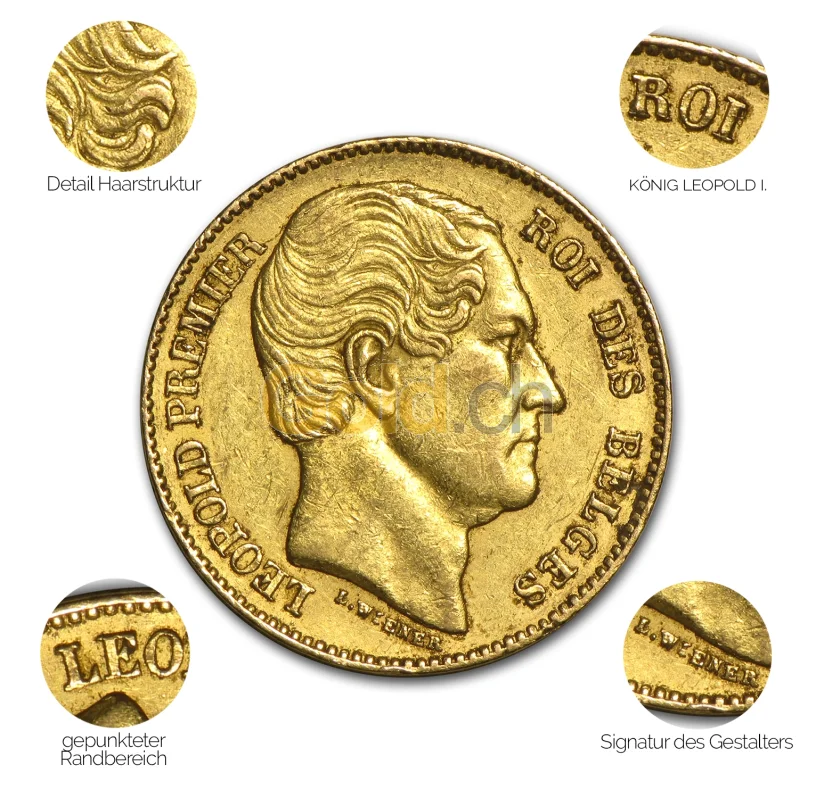 Die Goldmünze zeigt das Profil des herrschenden belgischen Königs Leopold I.: „LEOPOLD PREMIER“ verläuft am linken Rand der Münze und auf der anderen Seite steht „ROI DES BELGES“. In der Mitte blickt das Porträt des Königs nach rechts. Unterhalb ist der Name des Künstlers geprägt: „L. WERNER“.