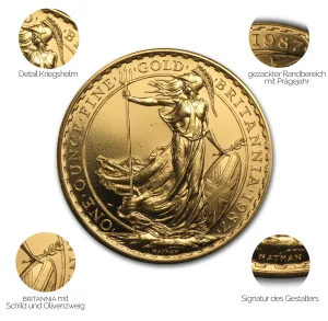 Die Anlagemünze Britannia stammt aus dem Hause der britischen Prägeanstalt Royal Mint. Im Jahre 1987 wurde die erste Auflage der Britannia in vier Stückelungen geprägt. Bis heute ist die Britannia in 1/10, ¼ , ½ und 1 Unze erhältlich. Der Nennwert der Münze reicht von 10 über 25 bis zu 50 und 100 Pfund. Der Feingehalt der Goldmünze beträgt seit 2013 99,99 % (24 Karat). Zuvor lag er bei 22 Karat und in den ersten zwei Jahre der Produktion bestand die Goldmünze aus einer Legierung mit Kupfer (1/12). Sie gilt als die erste Anlagemünze Europas und bietet bis heute eine attraktive Gelegenheit zur Anlage. Daneben bringen wechselnde Darstellungen der Gottheit Britannia Sammlern eine reiche Abwechslung.