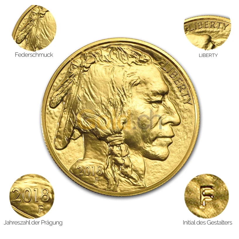 Die Vorderseite der Gold-Anlagemünze zeigt einen auf einem Hügel grasenden Büffel unter dem 50 $ (Dollar) bei 1 oz angegeben sind. Auf der Rückseite ist das Porträt eines nordamerikanischen (USA) Ureinwohners zu sehen. Die Motive haben einen Wildlife-Charakter.