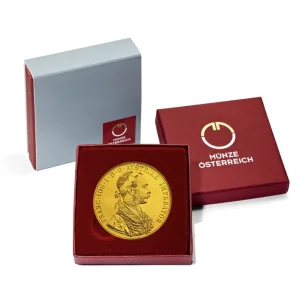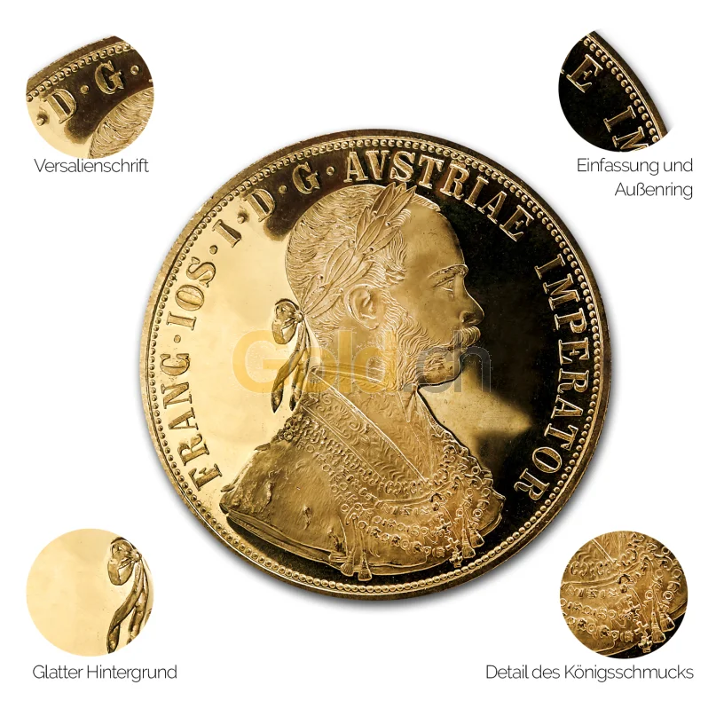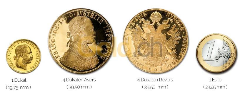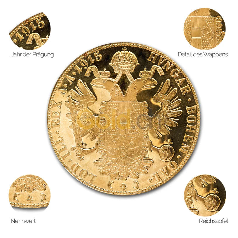 Das historische Dukatengold des Kaiserreichs Österreich wurde von 1872 bis 1915 geprägt. Seither erscheinen die Goldmünzen von hoher Reinheit als offizielle Nachprägungen mit der Jahreszahl 1915 – als letztes originales Prägejahr. Erhältlich sind die Goldstücke als 1 Dukat oder 4 Dukaten. Ein Nennwert ist nicht aufgeprägt, die Münzen unterscheiden sich lediglich durch Größe und Gewicht. Ihre Vorderseite bildet Kaisers Franz Joseph I. von Österreich ab, während die Rückseite das reich verzierte kaiserliche Wappen zeigt. Wegen des hohen Feingehalts von 98,6 % ist das Dukatengold insbesondere in Europa eine beliebte Anlagemünze und eine preiswerte Alternative zu anderen Goldmünzen. Das große Gold besitzt ein Feingewicht von 13,768 Gramm oder 0,4427 oz (Unzen Gold) bei einem Durchmesser von 39,5 Millimeter.