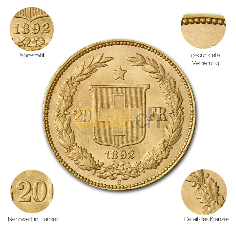 Auf der Rückseite der Helvetia-Goldmünze schmückt ein aus Eichenzweigen und Lorbeerblättern geflochtener Kranz den Münzgrund. Das Symbol der Eiche spielt in vielen Nationen eine große Rolle: Es steht als politischen Symbol für souveräne Macht und Treue. Schon in der Antike fand das Eichenblatt Verwendung als Randdekoration von Münzen. Das Schweizer Wappen wurde ab 1867 auf die Rückseite der 20 Franken-Münze geprägt. In der Mitte des Wappens befindet sich ein vierarmiges Kreuz.