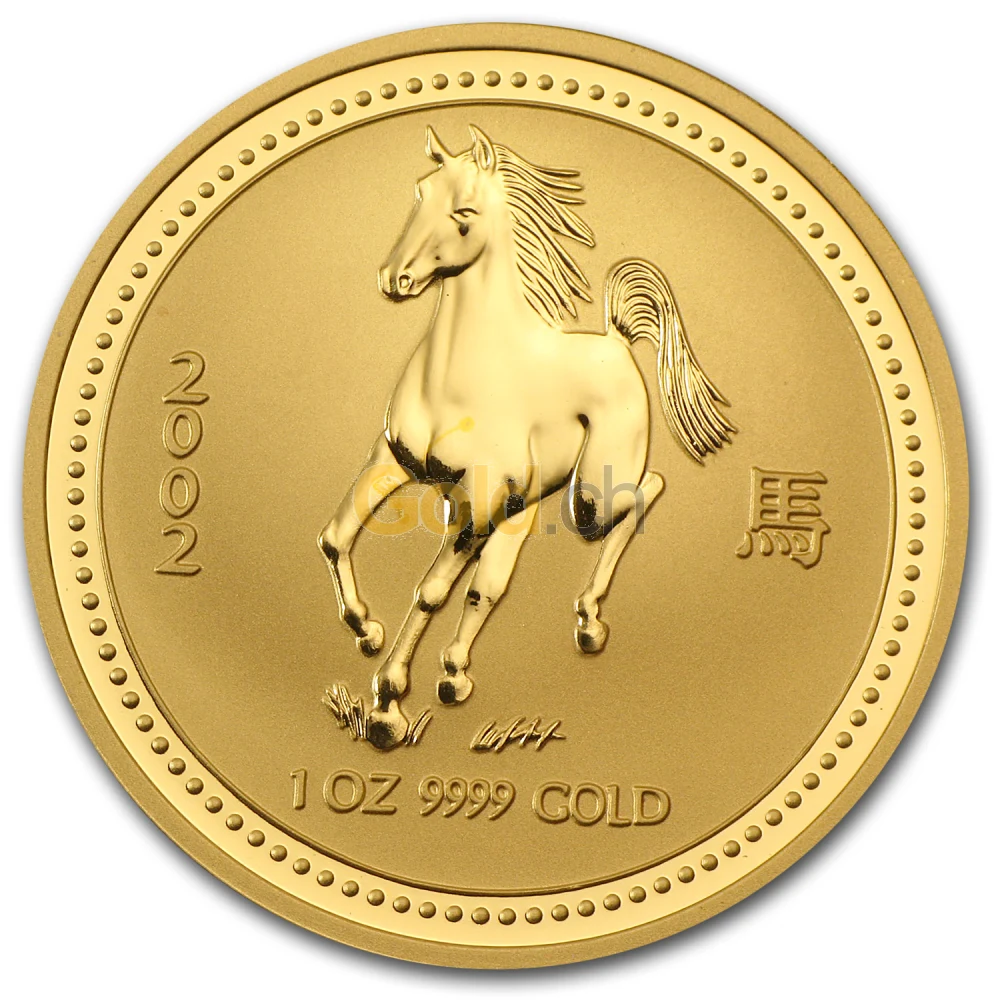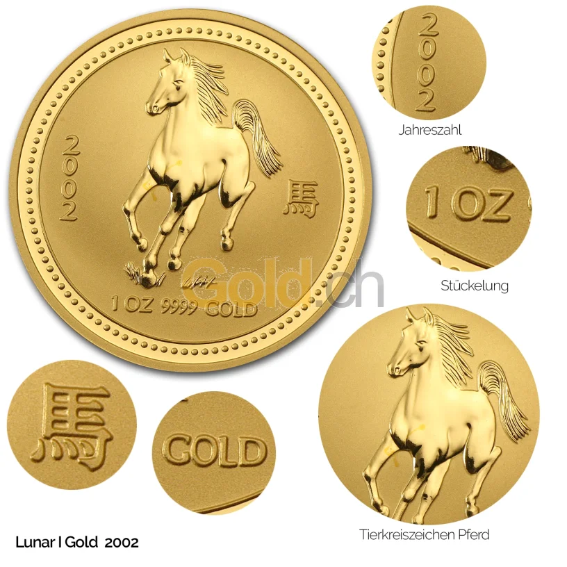 Die Prägung der Lunar-Goldmünze aus dem Jahre 2002 stellt das siebte Tierkreiszeichen des chinesischen Mondkalenders dar: das Pferd. Das grazile Tier bewegt sich im Trab auf den Betrachter der Münze zu. Unter seinen Hufen ist eine kleine Stelle Gras zu sehen. In der Dynamik der Bewegung wehen die Mähne und der Schweif des Tieres in die Luft.