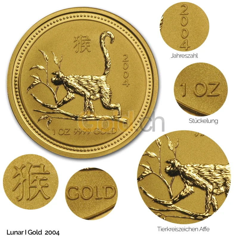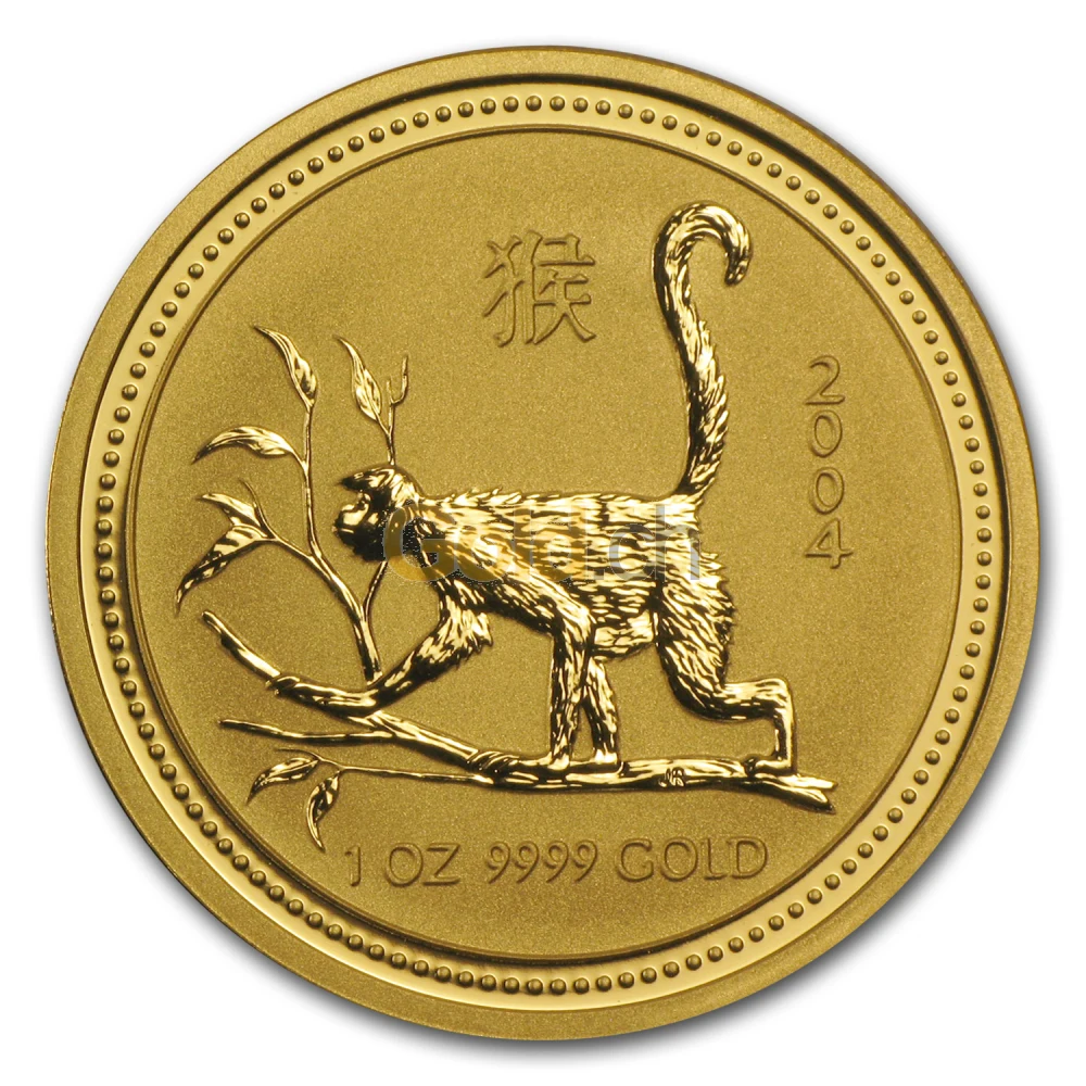 Auf der Goldmünze der Lunar-Serie aus dem Jahre 2004 ist ein Affe abgebildet. Auf seinen Vieren schleicht er mit hochgehobenem Schwanz einen Ast entlang. Er ist von der Seite zu betrachten und bewegt sich zur linken Seite der Münze. Am Ende des Astes sind Blätter zu sehen.