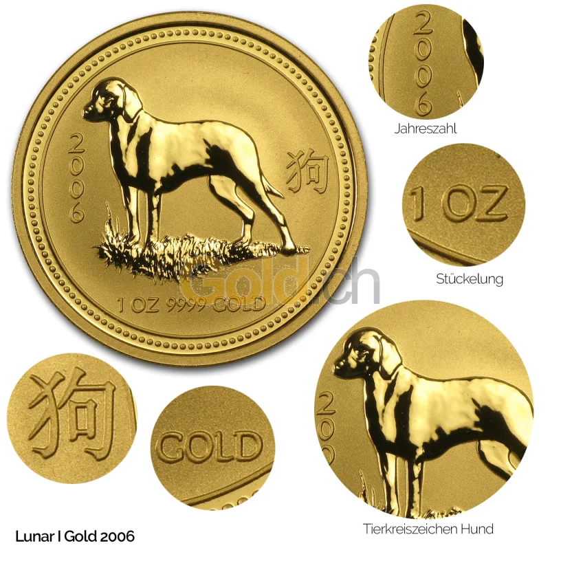 Auf der Goldmünze aus dem Jahre 2006 ist der Hund, das elfte Tierkreiszeichen aus dem chinesischen Mondkalender abgebildet. Das an einen jungen Jagdhund erinnernde Tier ist von der Seite dargestellt und blickt zum linken Rand der Münze. Die Prägung lässt das Fell des Hundes glänzen.
