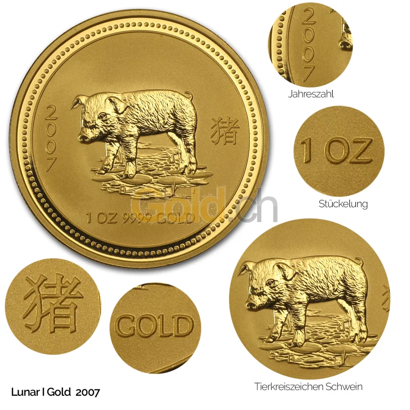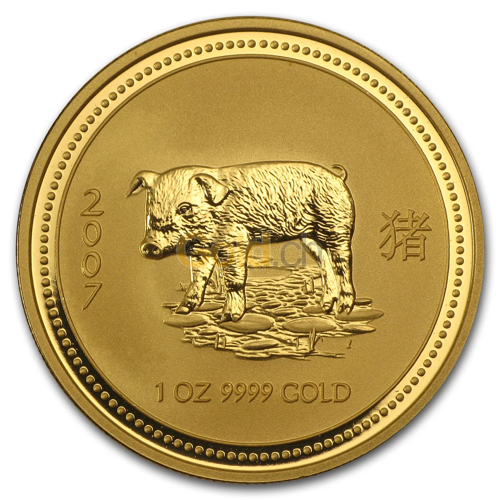 Im Jahre 2007 erscheint das letzte Tierkreiszeichen aus dem chinesischen Mondkalender: das Schwein. Auf der Goldmünze ist ein kleines Ferkel abgebildet, das auf einem mit Steinen belegten Weg steht. Es blickt zur linken Seite der Münze und ist von einem leichten Flaum bedeckt.