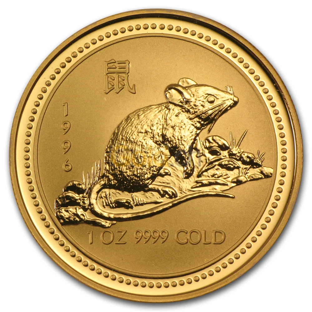 Auf der ersten Goldmünze aus der Lunar-Serie ist das Tierkreiszeichen des Jahres 1996 zu sehen. Im chinesischen Kalender ist das die Ratte, auf der Goldmünze ist (aus ästhetischen Gründen) eine Maus, statt einer Ratte, abgebildet. Sie sitzt auf einem von Steinen und Grashalmen durchsetzten Stück Boden und hat ihre Vorderpfoten leicht angehoben.
