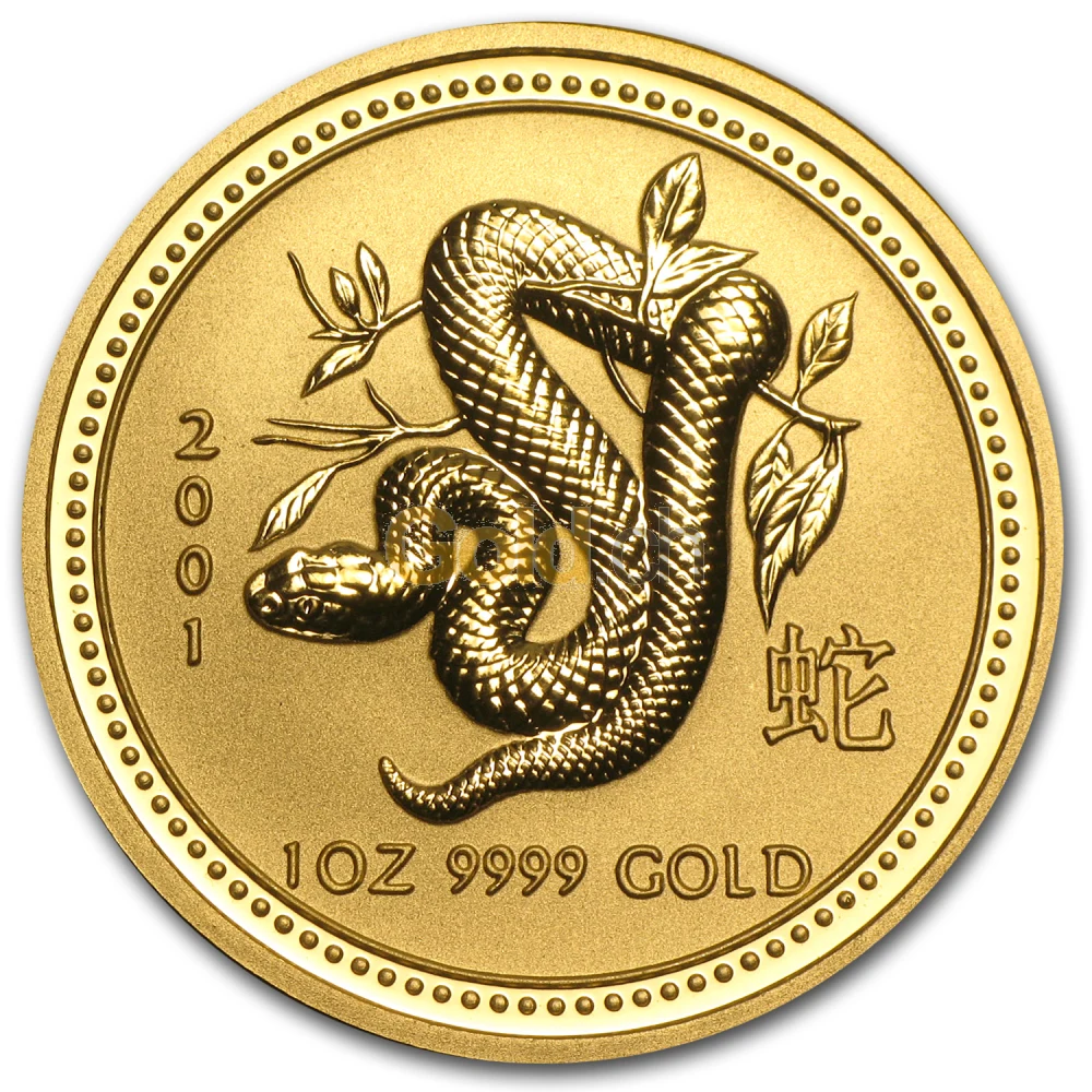 Die Goldmünze aus dem Jahre 2001 zeigt eine um einen Ast gewundene Schlange. Die detailreiche Prägung legt Wert auf die Darstellung der schuppigen Haut. Das Reptil blickt mit seinem waagerecht ausgerichteten Kopf fokussiert zur Seite.