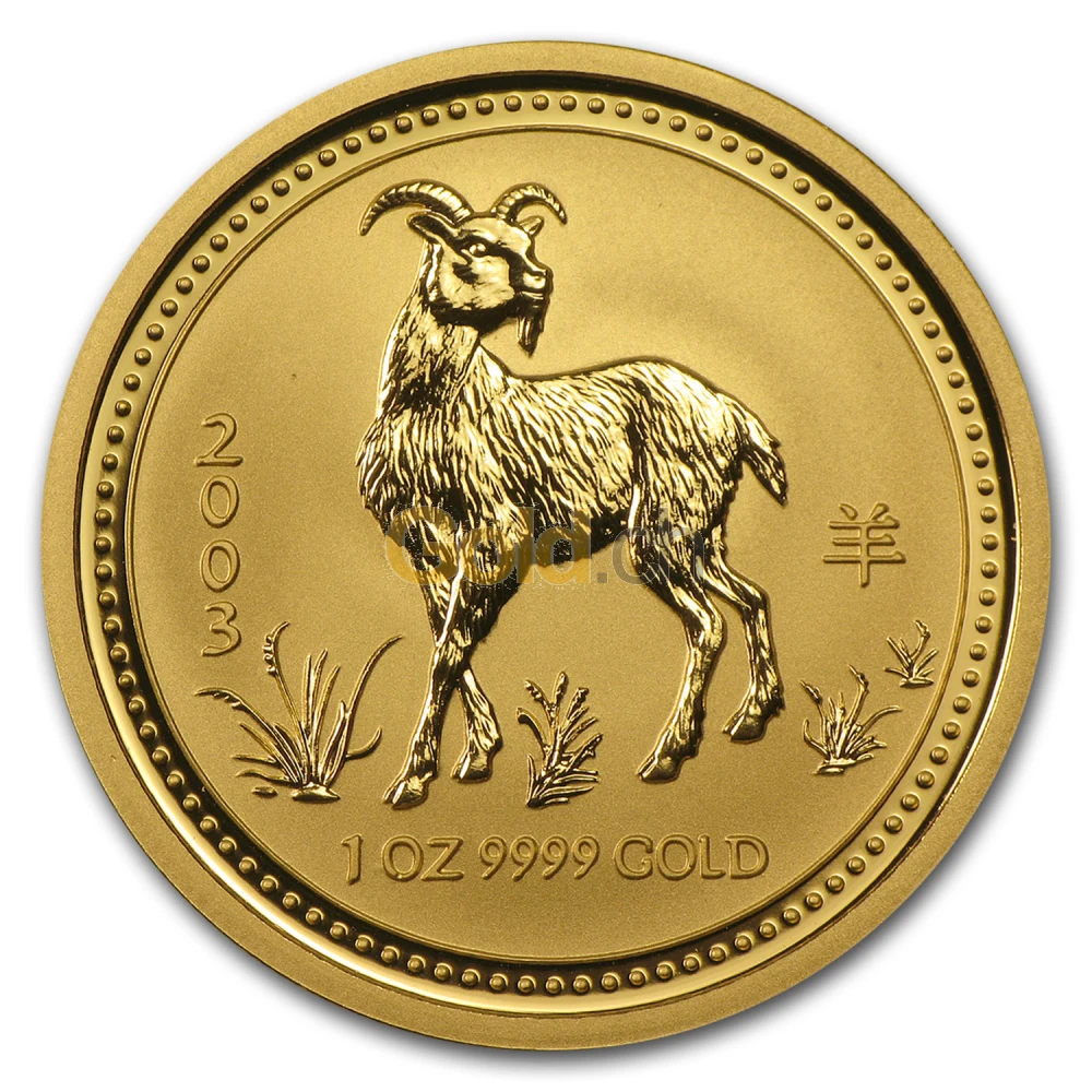 Die Prägung der Goldmünze im Jahre 2003 zeigt eine Ziege, welches auf einer durch Grasbüschel angedeuteten Wiese spaziert. Mit einem neugierig in die Luft gestreckten Kopf blickt das Tier zur rechten Seite der Münze. Die Prägung legt Wert auf die Details des Huftiers wie Hörner, Ziegenbart und Fell.