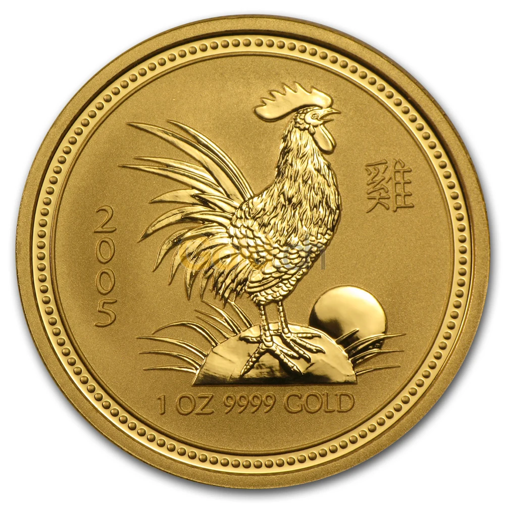 Im Jahre 2005 stellt die Goldmünze einen krähenden Hahn bei aufgehender Sonne im Hintergrund dar. Der mit einem ausdrucksstarken Federkleid geschmückte Vogel steht auf einem kleinen Erdhügel, von dem ein paar Grashalme abstehen. Ein Kamm von beeindruckender Größe schmückt den Kopf des Vogels.