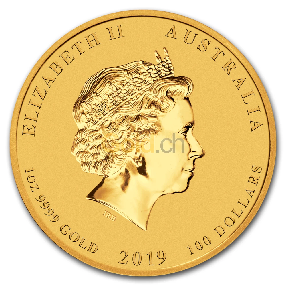 Das Rückseitenmotiv des 2019er Australien Lunar stellt ein Hausschwein dar, mit erhobenem Rüssel als Zeichen für Glück und Gesundheit. Tatsächlich beinhaltet die Darstellung des Schweins auch Elemente seiner wild lebenden Verwandten, der Wildschweine, wie das borstige Fell, die langen Beine oder die hochstehenden Ohren. Komplettiert wird das Motiv durch Gräser, Felsen und üppige Äste. Am Boden folgt die Bezeichnung "Year of the Pig" der Münzrundung. Entgegengesetzt dazu ist am Münzkopf das chinesische Wort für Schwein platziert: "zhū" bedeutet auch ehrlich. Das Münzzeichen P für Perth Mint ist dezent im rechten Bereich integriert. Abgerundet wird das Design durch die charakteristische Randgestaltung der 2. Serie und den schmalen Außenring.