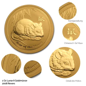 Mit dem Motiv der Maus beginnt 2008 die zweite Serie des Lunargoldes. Es zeigt ein eher zierliches Nagetier, das am Boden kauert und abwartet. Sein dünner, langer Schwanz liegt seitlich neben ihm. Bambusblätter über dem Kleintier deuten ein schützendes Dickicht an und zwischen den Blättern verbirgt sich das Münzzeichen P. Das China-Schriftzeichen über dem Kopf des Tieres bedeutet sowohl Maus wie Ratte und wird universell eingesetzt. Darüber hinaus steht "shŭ" auch für verwegen. Eindeutiger ist die Beschriftung am Münzboden, sie lautet "Year of the Mouse".
