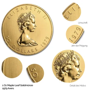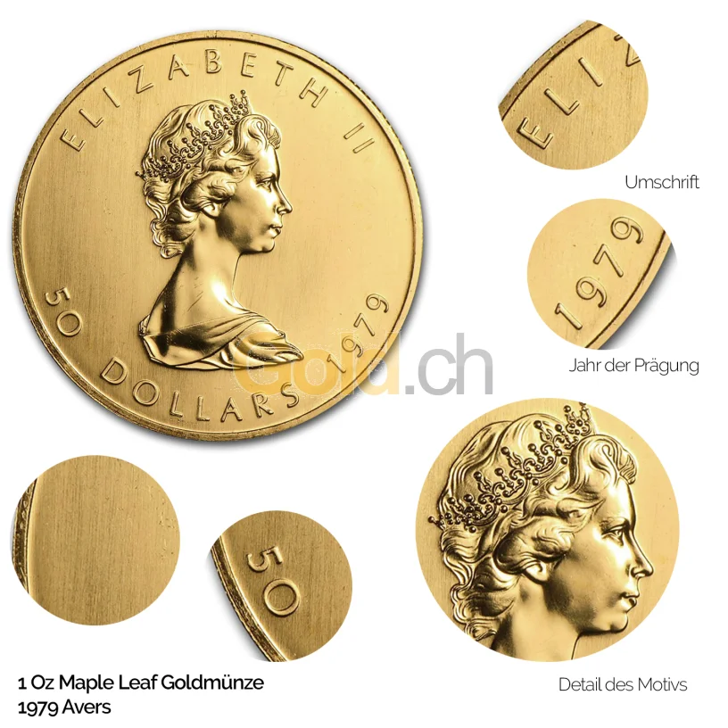 Das erste Prägejahr des Maple Leaf Goldes markiert eine Besonderheit auf dem weltweiten Markt der Anlagemünzen. Es ist die erste Goldmünze, die mit der hohen Feinheit von 999/1000 geprägt wird. Auf dem Avers erscheint das Portrait der 39-jährigen Queen Elizabeth II in der Gestaltung von Arnold Marchin aus 1964. Als einzigen Schmuck trägt die Monarchin eine Krone. Eingefasst wird das Bildnis von der Umschrift: »EIZABETH II« sowie »50 DOLLARS 1979«. Der Münzgrund ist matt und glatt gehalten.