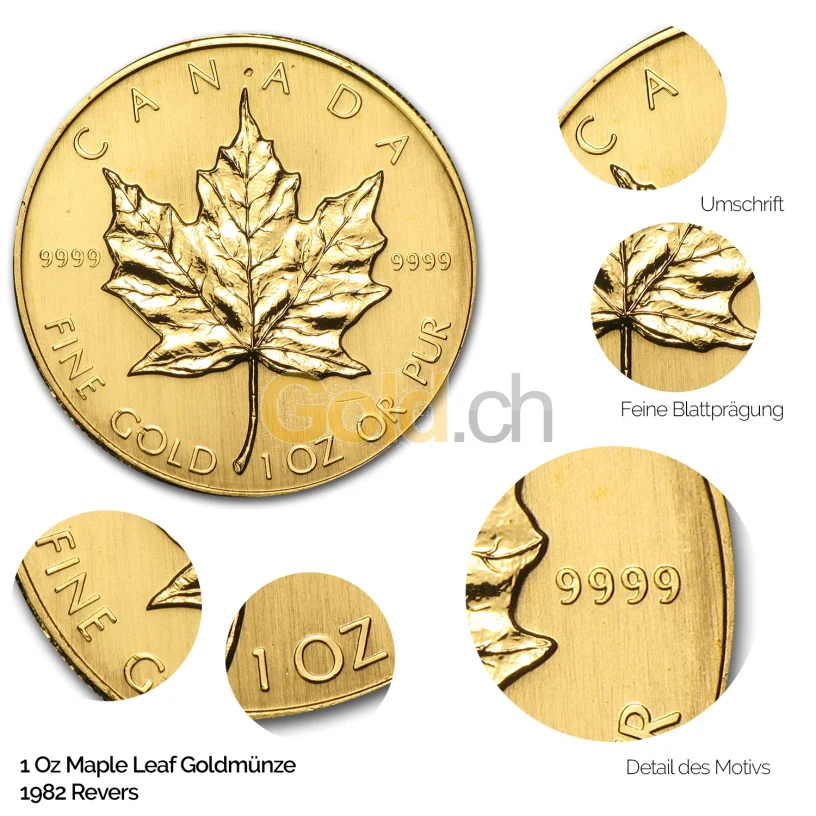 Eine weitere Neun zeigt die große Veränderung der Jahrgänge ab 1982 an. Erstmals erscheint der Gold Maple Leaf als 999,9/1000er Ausgabe. Damit markiert die Royal Candian Mint einen neuen Meilenstein in der internationalen Münzprägung. Deutlich ist der neue Feingehalt auf der Bildseite mit der Kennzeichnung »9999« links und rechts neben dem Ahornblatt zu lesen.