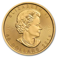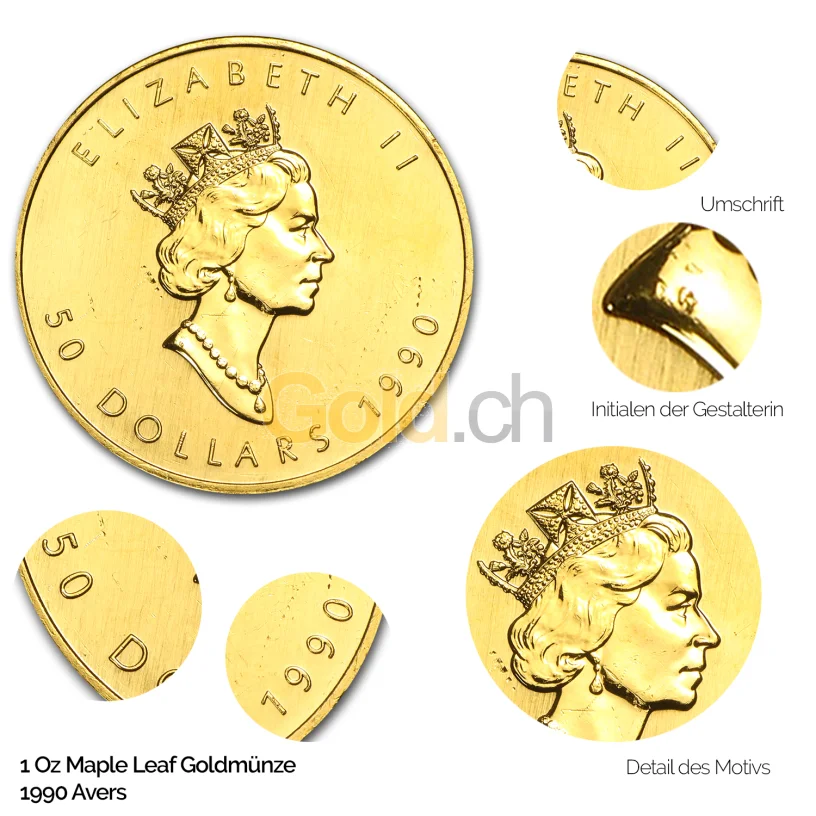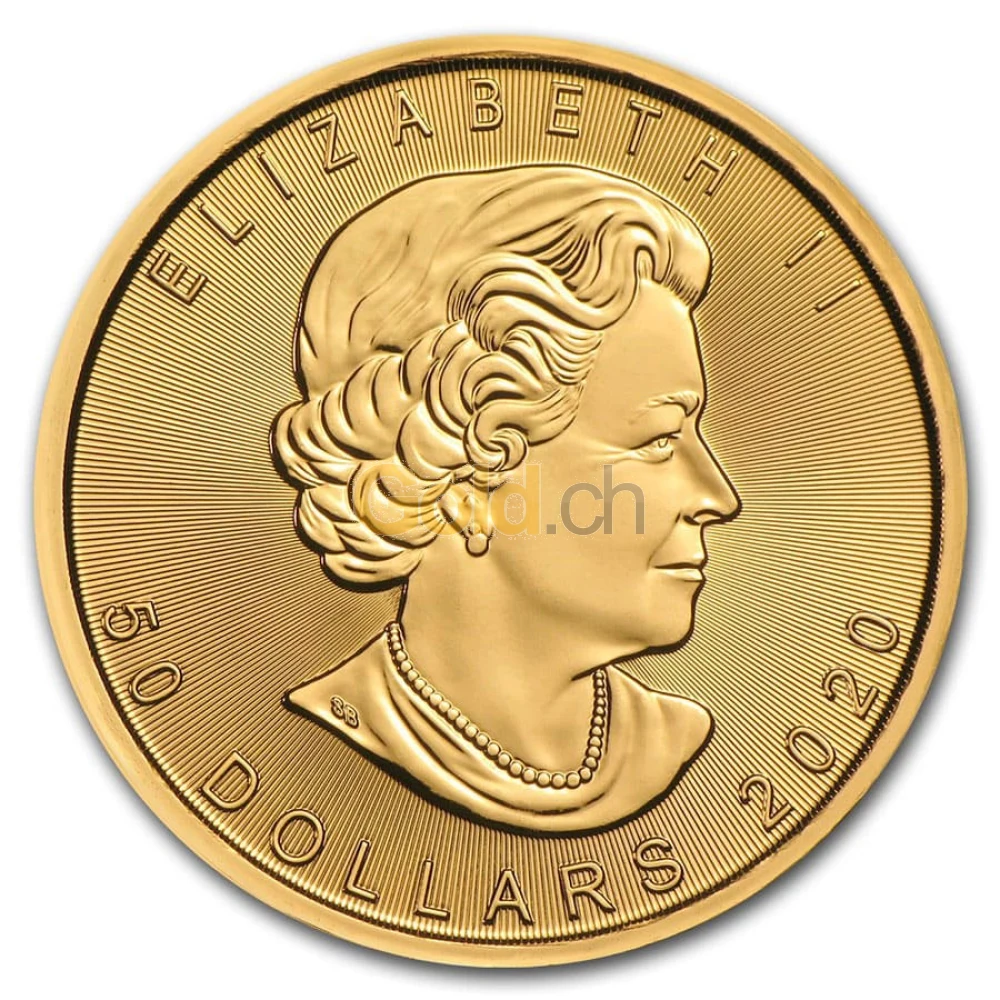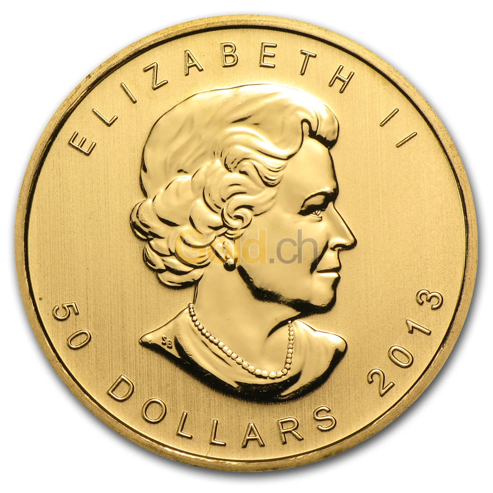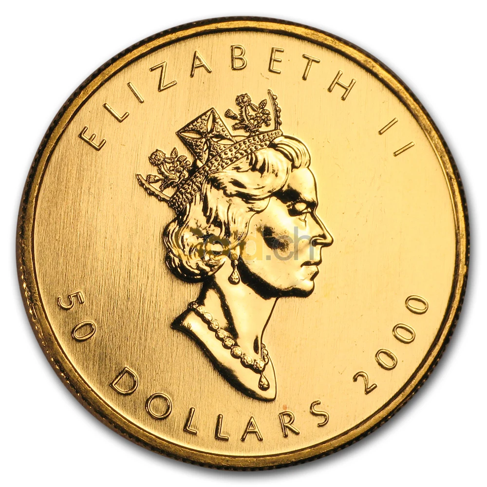 Ebenso gleichbleibend wie das Revers-Motiv ist auf der Wertseite kontinuierlich das mehrfach aktualisierte Portrait der britischen Königin Elisabeth II abgebildet. Gleichermaßen ist der Nennwert aufgeprägt, der bei der Einunzen-Münze 50 Kanadische Dollar (CAD) entspricht. Damit ist der Maple Leaf gesetzliches Zahlungsmittel in Kanada. Wie bei allen Goldmünzen, die sich nah am Goldpreis orientieren, überschreitet der Wert des Edelmetalls das Nominal jedoch um ein Vielfaches. Daher ist es eher als dekorative Ausstattung zu werten.