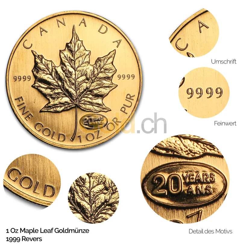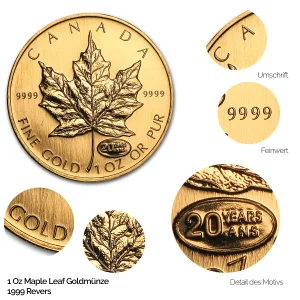 Die Goldmünze des Jahres 1999 zelebriert auf der Bildseite das 20. Erscheinungsjahr der Maple Leaf Goldmünzen. Rechts unterhalb des Ahornblatts befindet sich der zweisprachige Miniaturstempel mit der Inschrift »20 YEARS/ANS«.