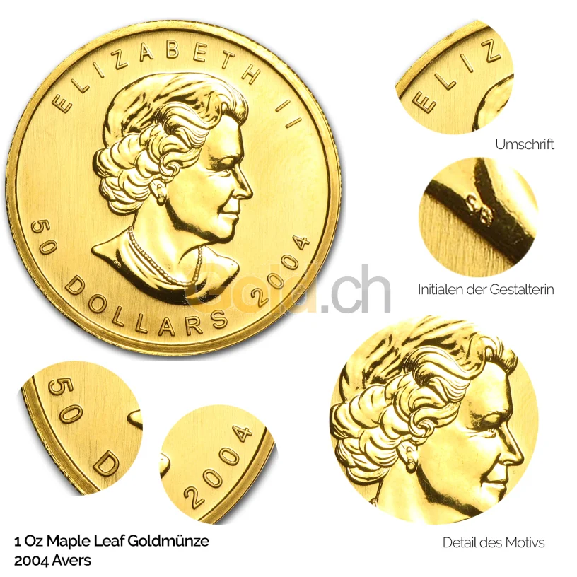 Die Maple Leaf Goldmünze geht mit der Zeit und präsentiert auf der Wertseite ab 2004 ein aktualisiertes Konterfei der englischen Königin. Das neue Portrait zeigt Queen Elizabeth im Alter von 79 Jahren. Es stammt von Susanna Blunt, die es 2003 entworfen hatte. Die britische Herrscherin ist ohne Krone aber mit elegantem Perlenschmuck dargestellt.