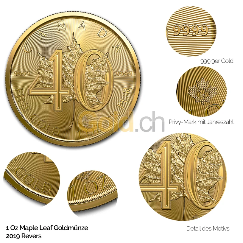 Zum 40. Prägejubiläum des Maple Leaf erscheint 2019 eine speziell gestaltete Sammlerausgabe der 1-Unzen-Goldmünze, welche eine große 40 auf der Bildseite integriert sowie den Zeitraum »1979-2019« auf der Wertseite. Die Bullionmünze des Jahrgangs ist ebenso gestaltet, bis auf die Zeitspanne. Zu besonderen Anlässen bringt die Mint zudem verschiedene 2 Unzen und 5 Unzen-Ausgaben in Prägequalität Polierte Platte heraus: