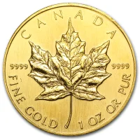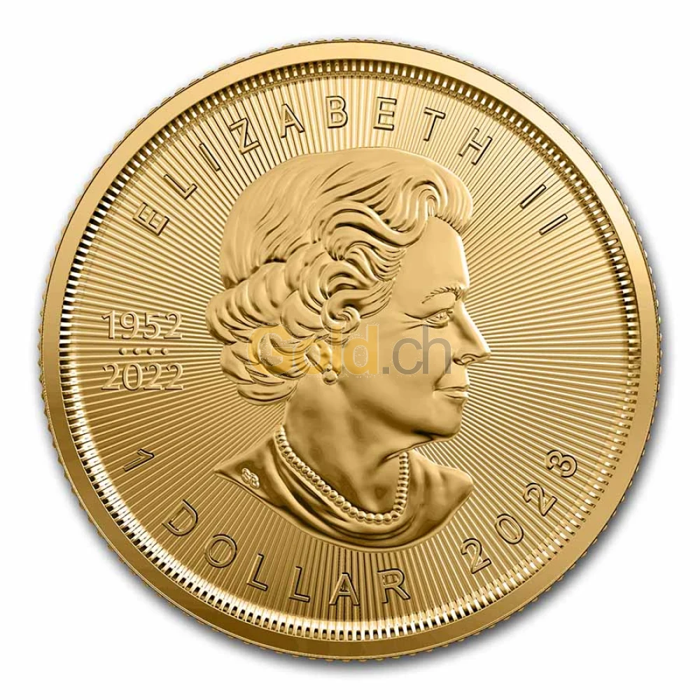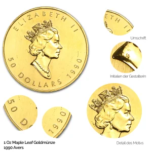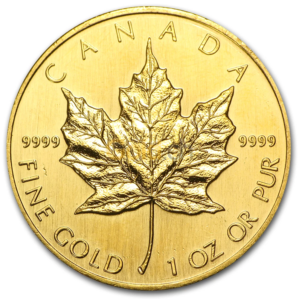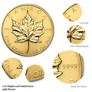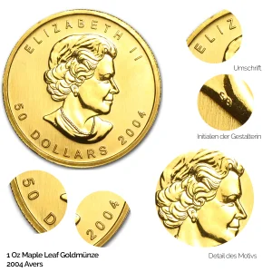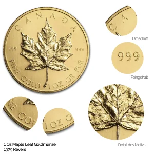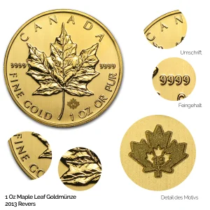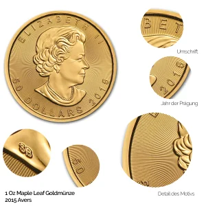 Elegant und aufwendig gestaltet präsentiert sich die Maple Leaf Goldmünze. Sie wird bereits seit 1979 von der Royal Canadian Mint herausgegeben und gilt als weltweit erste Bullionmünze mit der hohen Feinheit von 999,9/1000 Gold. Das jährlich gleichbleibende Motiv der Bildseite zeigt ein Ahornblatt – Englisch maple leaf – das Nationalsymbol Kanadas. Neben Krügerrand, Wiener Philharmoniker, American Eagle oder Nugget/Känguru zählt sie zu den beliebtesten Anlagemünzen, dessen Wert sich nah am Goldpreis orientiert.