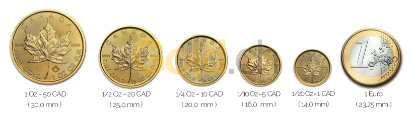 Größenvergleich Maple Leaf Goldmünze mit 1 Euro-Stück