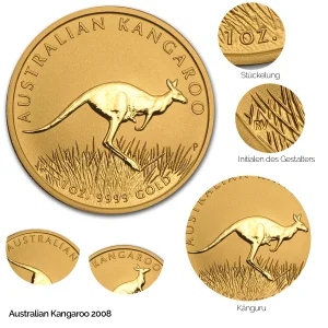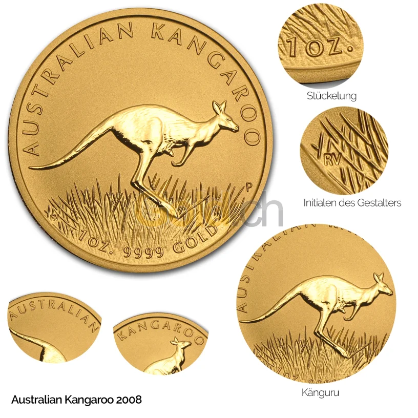 Im Jahre 2008 erschien die erste Goldmünze, auf der keine Jahreszahl des Prägejahres zu sehen war. Außerdem ändert sich ab dieser Prägung der Schriftzug von „The Australian Nugget“ zu „Australian Kangaroo“. Dafür traten nun die Initialen der Gestalter in den Vordergrund. Auf der Goldmünze ist eine Kängurumutter im Sprung zu sehen. Aus ihrem Beutel schaut der kleine Kopf ihres Jungens heraus. Im unteren Drittel der Münze ist die australische Fauna, in diesem Fall rein aus Gras bestehend, zu sehen. Der gesamte Hintergrund der Münze ist matt und im oberen Drittel entlang der Münze steht „Australien Kangaroo“