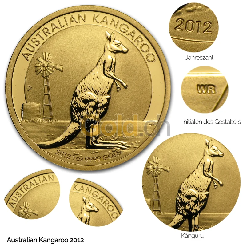 Das Känguru auf der Goldmünze aus dem Jahre 2012 steht aufrecht und zentral in der kargen Landschaft. Zum ersten Mal findet sich in der Darstellung die Einwirkung von Menschen wieder. Im Hintergrund ist auf der rechten Seite ein Windrad zu sehen neben dem ein Stapel steht.