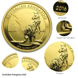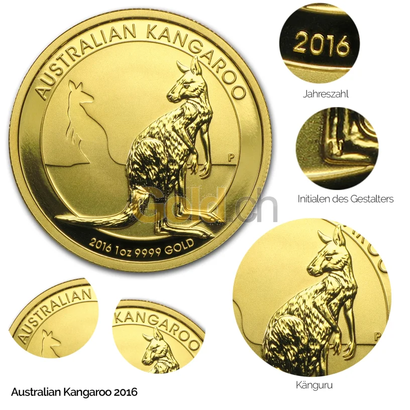 Die Goldmünze aus dem Jahre 2016 zeigt ein Känguru, das auf den Hinterbeinen steht und hinter sich blickt. Eine Silhouette des Kängurus erscheint hinter dem Känguru. Sie ist entlang einer Linie aus dem Hintergrund geschnitten. Die Gestaltung legt Wert auf die detailreiche Darstellung der Fellstruktur.