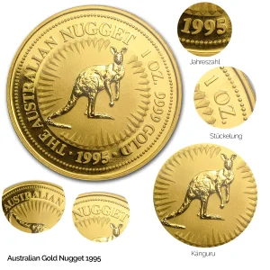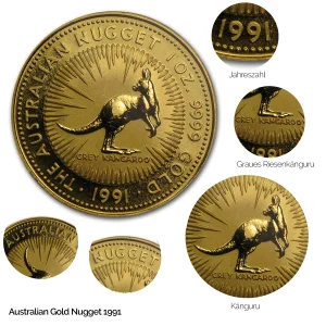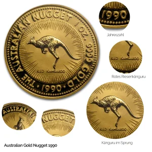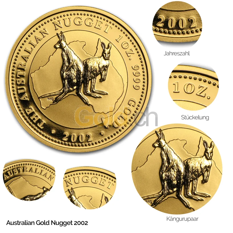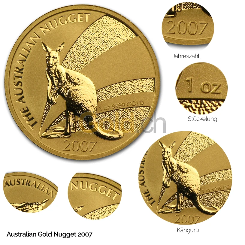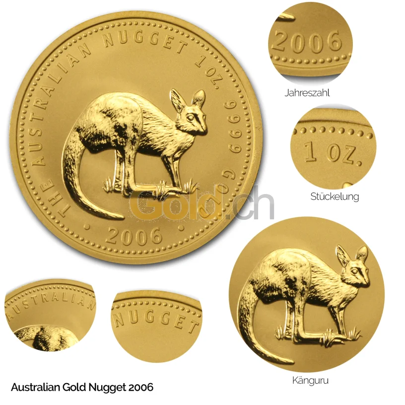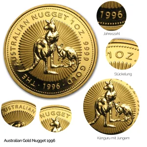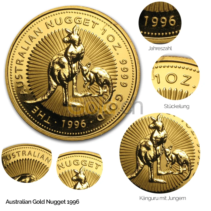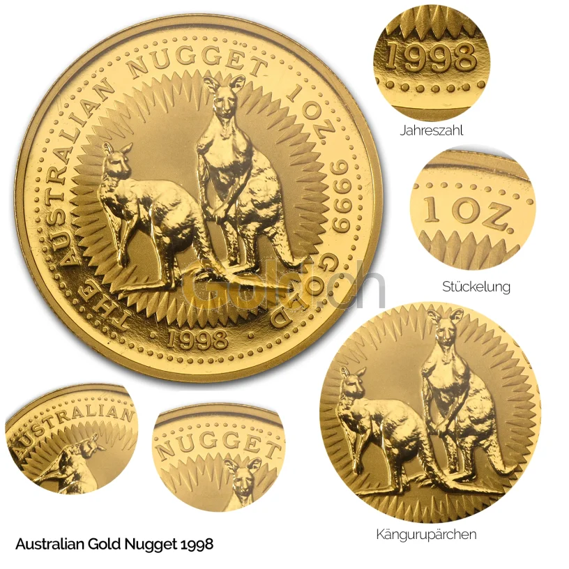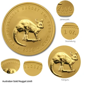 Im Jahre 1986 wurde die erste „Australian Gold Nugget“-Münze geprägt. Die ersten vier Jahrgänge der Goldmünze erklären ihren Namen, denn in dieser Zeit war ein Goldnugget das Motiv der Münzen. Ab 1990 wechselte das Motiv und seitdem erscheint jährlich eine neue Illustration eines Kängurus, dem Nationaltier Australiens. Die Münze aus dem Hause der australischen Prägeanstalt Perth Mint trägt daher seit 2008 auch den Namen „Australian Kangaroo“. Seit ihrer ersten Prägung ist die Goldmünze in fünf Stückelungen verfügbar: 1/20 oz, 1/10 oz, 1/4 oz, 1/2 oz, 1 oz. Im Jahre 1989 ergänzten die Stückelungen zu 2 oz, 10 oz, and 1 kg die Auswahl. Der Feingehalt entspricht 99,99 % (24 Karat). Mit jährlich wechselndem Motiv ist die Goldmünze „Australian Gold Nugget“ bzw. „Australian Kangaroo“ ein besonderes Sammlerstück. Daneben eignet sie sich als eine der bekanntesten Goldmünzen als Anlage.