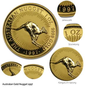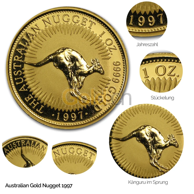 Das Känguru auf der „Australian Nugget“-Münze aus dem Jahre 1997 landet gerade in einer dynamischen Sprungbewegung auf seinen Hinterbeinen. Der balancierende Schwanz und der Kopf des Tieres durchbrechen die Zapfen, welche kreisrund um das Motiv angeordnet sind.