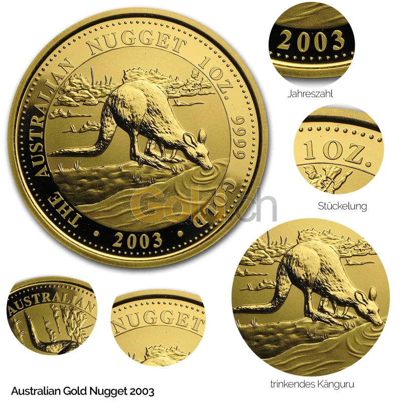 Die Prägung der Goldmünze im Jahre 2003 zeigt ein Känguru, welches am Ufer eines fließenden Gewässers trinkt. Die Darstellung legt nicht nur Wert auf die Fellstruktur des Tieres, sondern ebenso viel Wert legt auf Details im Hintergrund wie die Pflanzen, die hinter dem Känguru auftauchen.