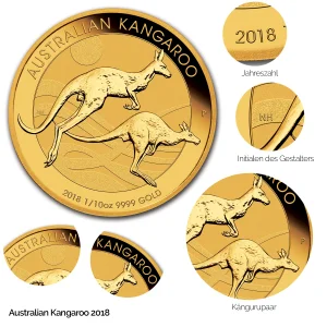 Im Jahre 2018 erschien eine Goldmünze, die zwei Kängurus im Sprung nebeneinander zeigt. Sie springen zum rechten Rand der Münze. Im Hintergrund sind abstrakte wellen- und kreisförmige Ornamente zu sehen, die sich matt vom glatten Hintergrund abheben.