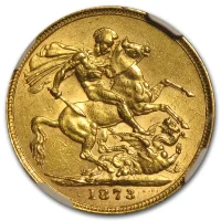 Die Goldmünze zeigt die junge Königin Victoria (Regentin von 1837 bis 1901). Der Revers bildet klassisch den heiligen Georg ab. Geprägt wurde des Gold-Sovereign in der englischen Kolonie von Australien.