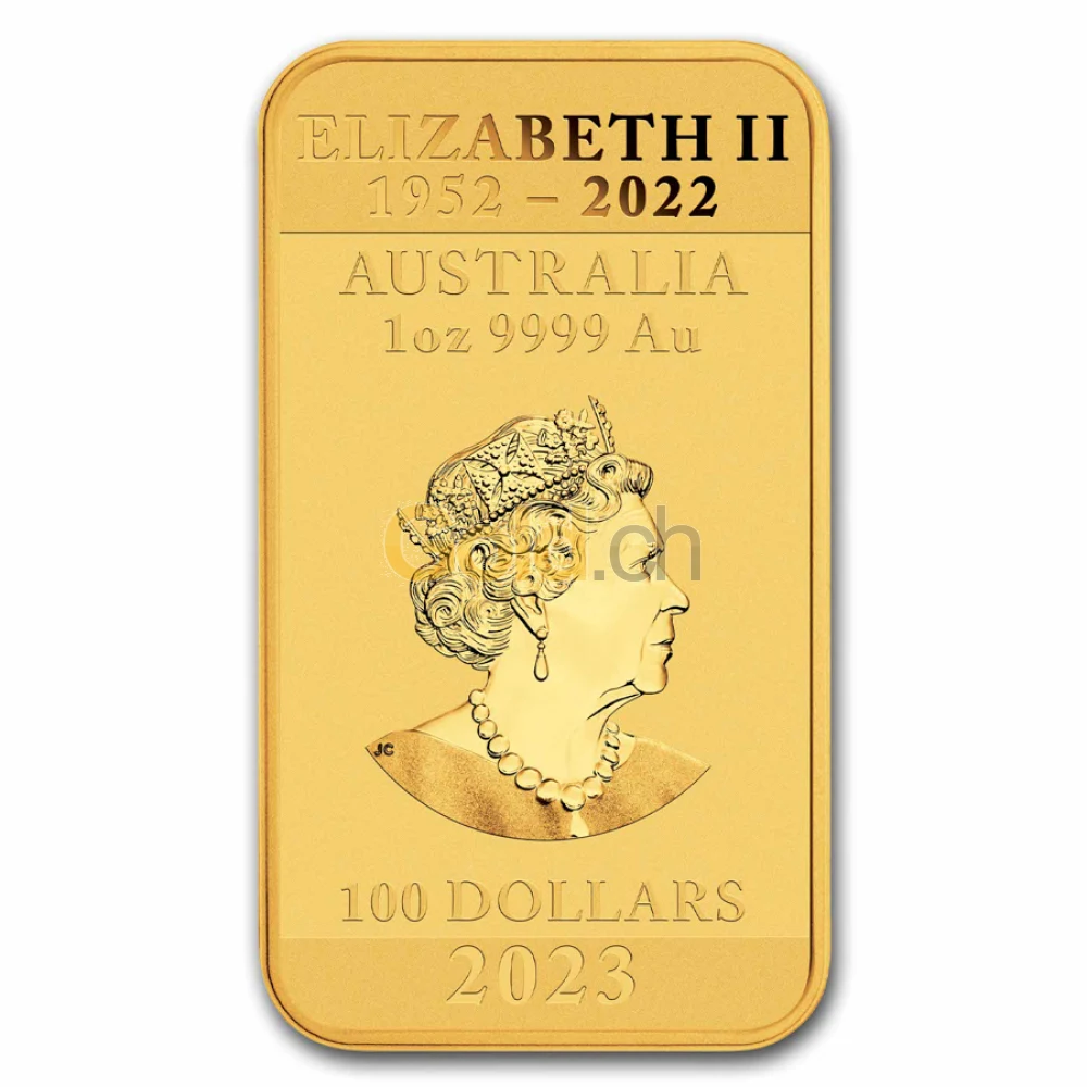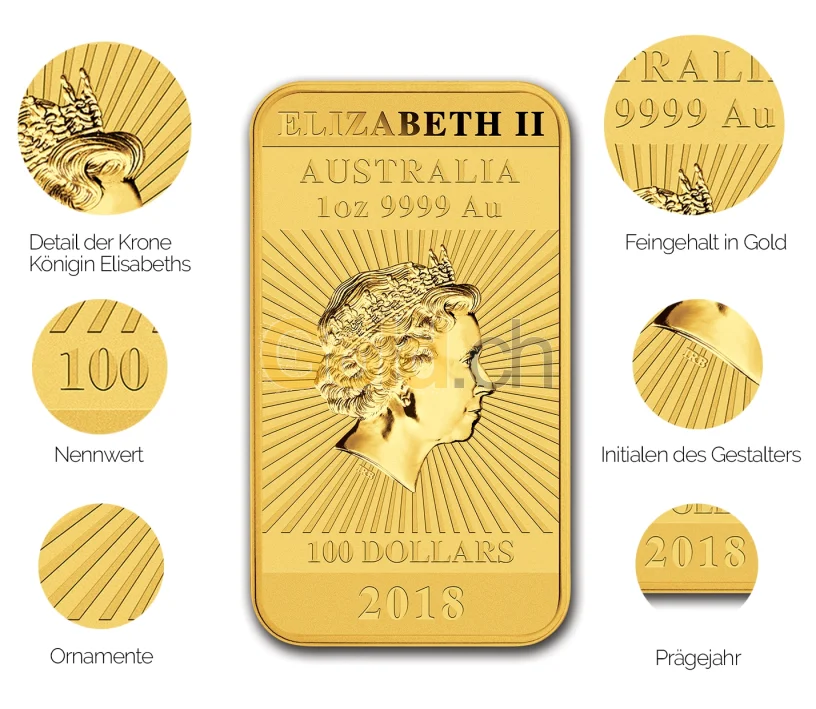 Auf der Vorderseite schmückt das strahlende vierte Porträt Königin Elisabeth II. den Münzbarren, welches auf allen Münzen des Vereinigten Englands und Commonwealth bis ins Jahr 2015 geprägt wurde. Das Porträt liegt in der Mitte des Münzbarrens und ist umgeben von glänzenden Strahlen, die radial um den Kopf der Königin angeordnet sind. Über ihrem königlichen Haupt steht „AUSTRALIA 1oz 9999 Au“ matt auf glänzendem Hintergrund. Am Kopf der rechteckigen Münze ziert „ELIZABETH II“ in glatt polierter Schrift den matten Hintergrund. Unter dem Bildbereich ergänzen „100 DOLLAR“ und „2018“ den Münzbarren.