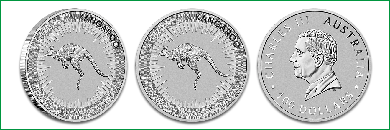 Im identischen Design wie die Silberausgabe erscheint ebenfalls die Platinmünze Australian Känguru. Sie wird ausschließlich in der Einheit zu 1 Unze angeboten und besitzt die Maße 32,6 x 2,9 Millimeter bei einem Raugewicht von 31,119 Gramm. Ihr Feingehalt beträgt wie bei Platinmünzen dieser Güte üblich 999,5/1000. Die Oberfläche ist in Stempelglanz ausgeführt. Präsentiert wird die Bullionmünze einzeln gekapselt, in der Tube mit 20 Exemplaren oder in der Masterbox mit 100 Stück (= 5 Tuben). Das Prägevolumen ist unlimitiert bis Ende 2025.