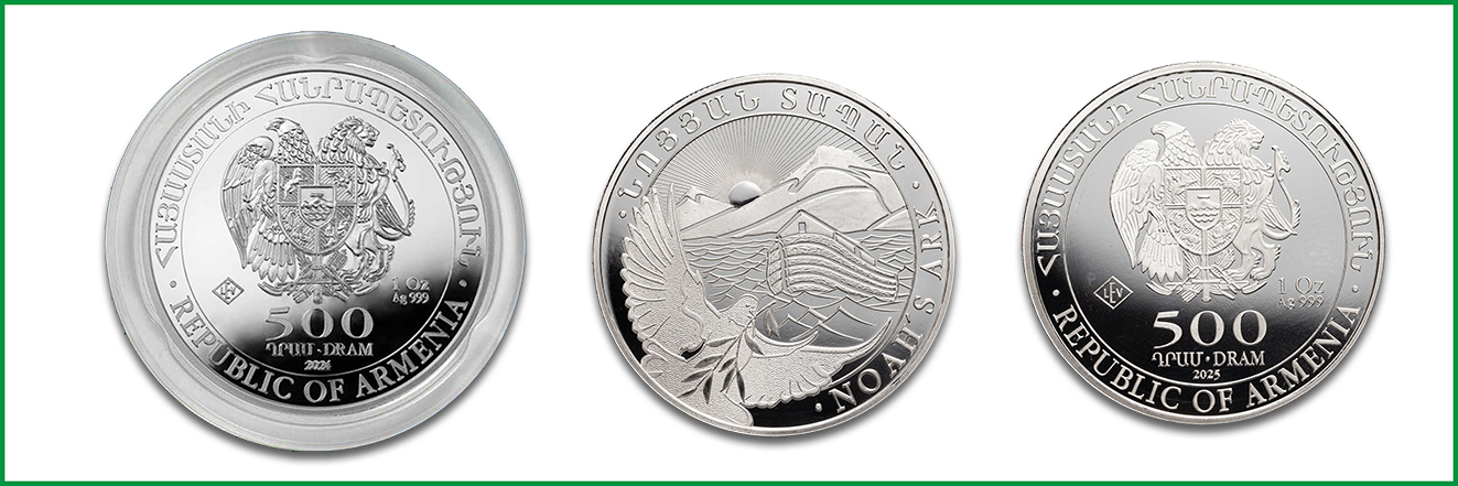 Für die Republik Armenien produziert die Leipziger Edelmetallverarbeitung (LEV) seit 2011 die gefragte Silbermünze Arche Noah. Neben der Hauptstückelung zu einer Unze ist das armenische Silber in sechs weiteren Einheiten von 1/4 bis 10 Unzen und zu 1 und 5 Kilogramm erhältlich. Es zeigt auf seiner Bildseite die biblische Arche Noah in der Sintflut vor der Küste Armeniens. Im Hintergrund ist der Berg Ararat vor der aufgehenden Sonne zu sehen. Eine Taube mit Olivenzweig im Schnabel weist den Weg zum Land. Die Wertseite mit dem Nennwert in Armenische Dram (AMD) stellt das Landeswappen der Republik Armenien zusammen mit den übrigen technischen Daten der Silbermünze dar. Anleger können bei der 1-Unzen-Einheit zwischen Einzelmünze, 20er-Tube und 500er-Masterbox wählen.