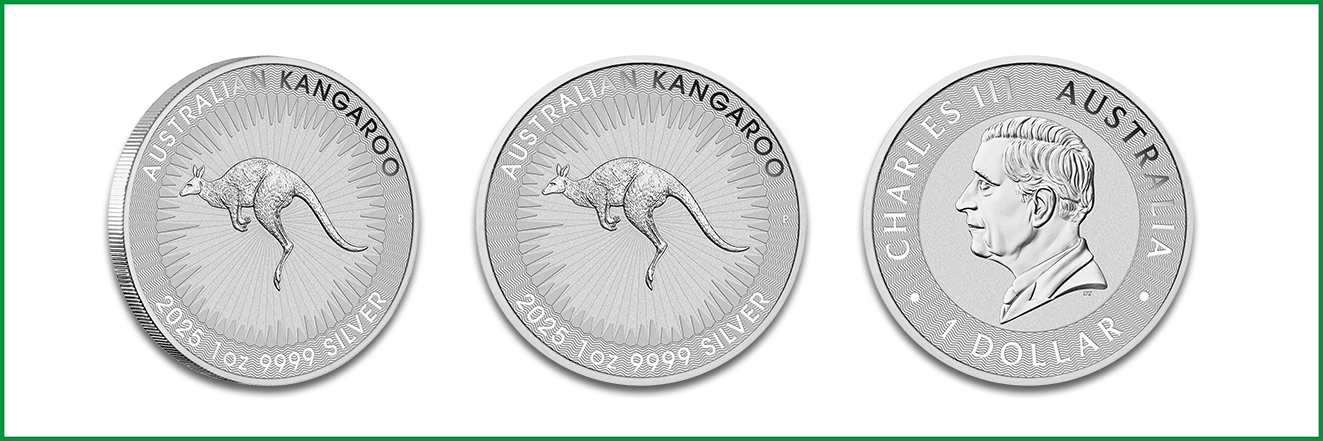 Zu den Klassikern unter den Bullionmünzen zählt ebenfalls die Silbermünze Australian Känguru, die erstmals 2015 in einer limitierten Edition erschien. Seit 2016 wird sie von der Perth Mint unlimitiert geprägt. Ihr wiederkehrendes Motiv ist das springende Riesenkänguru vor einem stilistischen Sonnenstrahlen-Hintergrund, der zugleich der Fälschungssicherheit dient. Eingerahmt ist das Motiv von einer Umschrift mit Münznamen und den Feindaten. Das Silber-Känguru ist nur zu einer Unze erhältlich. Auf der Wertseite ist das königliche Staatsoberhaupt Australiens, King Charles III. zu sehen. Ergänzt wird das Design von Dan Thorne durch den Monarchentitel und den Nennwert über 1 Australische Dollar (AUD). Die Silbermünze ist einzeln erhältlich sowie in der Tube zu 25 Stück und in der Masterbox mit 10 Tuben, respektive 250 Münzen.