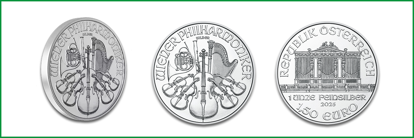 Die Silbermünze Wiener Philharmoniker wird seit 2008 von der Münze Österreich geprägt. Auf der jährlich identischen Bildseite sind neben dem Münztitel die wichtigsten Musikinstrumente des weltbekannten Orchesters abgebildet wie Geige, Chello, Harfe, Fagott und Horn. Die Wertseite stellt die große Orgel des Wiener Musikvereins dar. Ergänzt sind die Feindaten der Bullionmünze zu 1 Unze und der Nennwert über 1,50 Euro. Damit ist der Silber-Philharmoniker die erste offizielle Anlagemünze mit einem Nominal in Euro. Im Gegensatz zu den meisten anderen Münzen ist der Rand der Silberausgabe glatt und ohne Inschrift ausgeführt. Darin unterscheidet sich die Münze ebenfalls vom Gold-Phil, der eine Muster-Riffelung aufweist. Erhältlich ist Wiener Philharmoniker in Silber einzeln in Folie, als 20er-Tube und 500er-Masterbox.