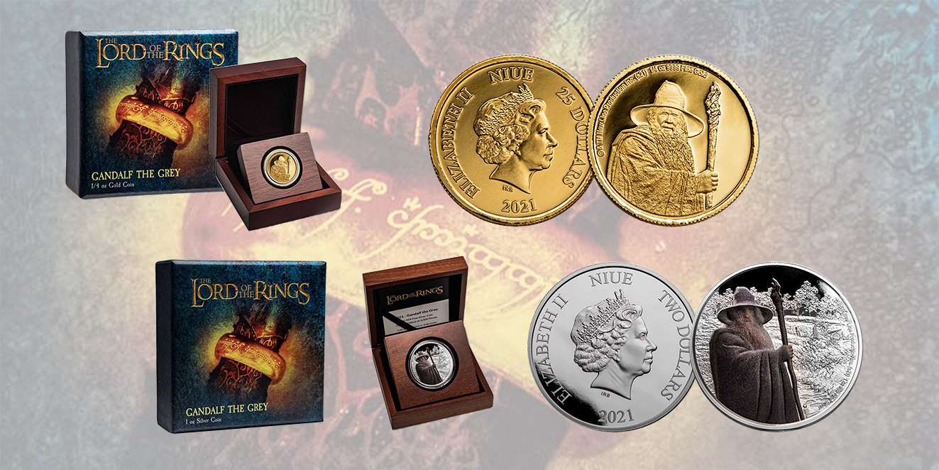 Bei der Münzreihe Lord of the Rings handelt es sich ebenfalls um eine noch recht junge Serie der New Zealand Mint. Sie hat verschiedene Motive aus der Fantasy-Saga Herr der Ringe zum Thema. Früher im Jahr erschien bereits das Motiv »Sauron« und mit der aktuellen Ausgabe »Gandalf der Graue« kommt nun die zweite Version auf den Markt. Sie ist jeweils in Qualität Polierte Platte als Goldmünze zu 1/4 Unze und als colorierte Silbermünze in der Einheit zu 1 Unze erhältlich. Wobei die Motivdarstellungen je nach Edelmetall etwas voneinander abweichen.