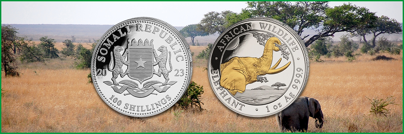 Die Münzserie African Wildlife Elephant wird seit 2004 als Agenturausgabe für die Republik Somalia in Ostafrika produziert. Unter Investoren und Numismatikern ist diese Serie besser bekannt unter der Bezeichnung Somalia Elefant Gold oder Somalia Elefant Silber. In einer Sonderprägung erscheint jetzt eine teilvergoldete Silbermünze, mit dem Serienmotiv für 2023: Ein einzelner Elefant pflückt mit seinem Rüssel einen Zweig vom Baum. Den Hintergrund bildet die weite Landschaft Afrikas mit ihrer charakteristischen Flora vor dem Kilimandscharo. Das Motiv ist von einem Außenring mit dem Münznamen, der Einheit und dem Feingehalt umgeben.