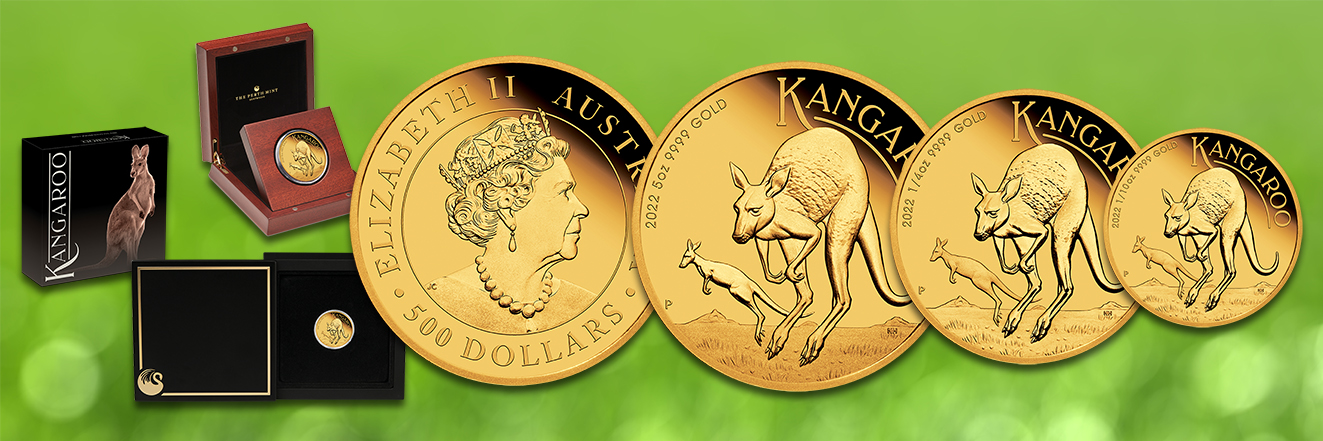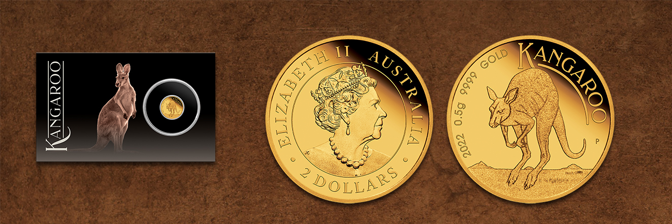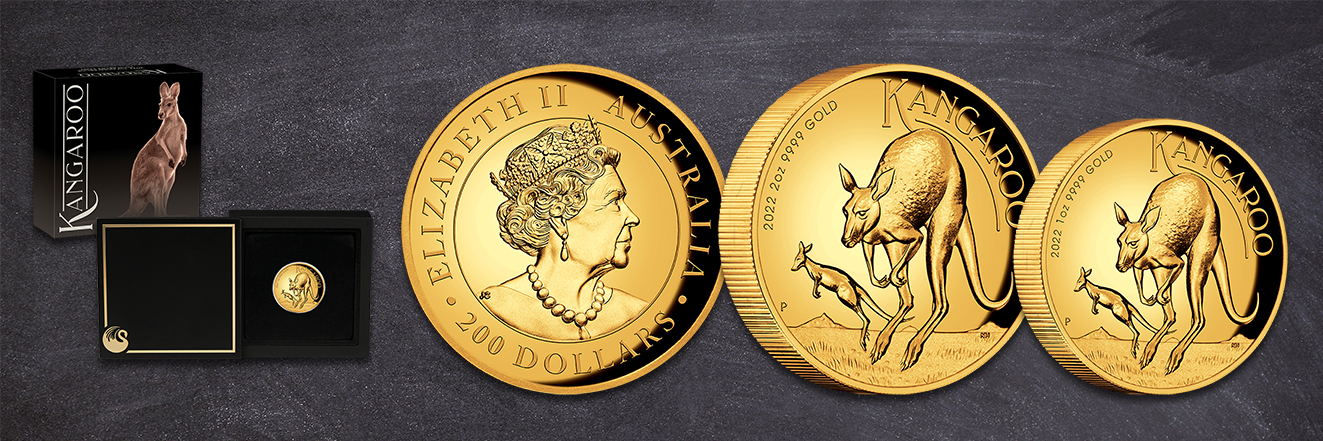 Im neuen 2022er-Design präsentiert sich die Goldmünze Känguru in der Prägequalität Polierte Platte. Sie zeigt auf ihrer Rückseite zwei rote Riesenkängurus in der australischen Steppe. Das Motiv wurde von Neil Hollis entwickelt, erkennbar an seinen Initialen (NH). Es integriert den Seriennamen sowie die Feindaten und das Erscheinungsjahr der Münze. Ihr Nennwert befindet sich prominent auf der Wertseite als Umschrift zusammen mit dem Monarchentitel. Im Zentrum erscheint die aktuelle Regentin Queen Elizabeth II. in der Darstellung von Jody Clark (JC).