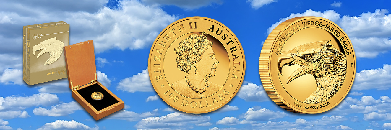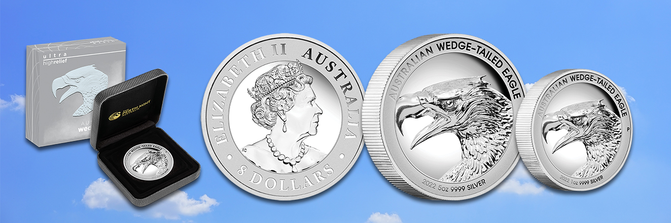 Das 2022er-Motiv aus der Wedge-Tailed Eagle-Reihe zeigt auf seiner Bildseite den Kopf eines Keilschwanzadlers, dem größten Raubvogel Australiens. Entworfen wurde das Design vom US-Designer John M. Mercanti. Die Silbermünzen sind in den Stückelungen zu 1 und 5 Unzen in einer speziellen Ultrahoch-Prägung erhältlich, die das Motiv dreidimensional erscheinen lässt. So betragen die Randstärken 6,1 Millimeter, respektive eindrucksvolle 11,85 Millimeter bei der 5 Unzen-Größe. Bei dieser Technik wird das Motiv auf eine tief gewölbte Oberfläche geprägt, die einen optimalen Metallfluss durch den Schlag des Stempels ermöglicht.
