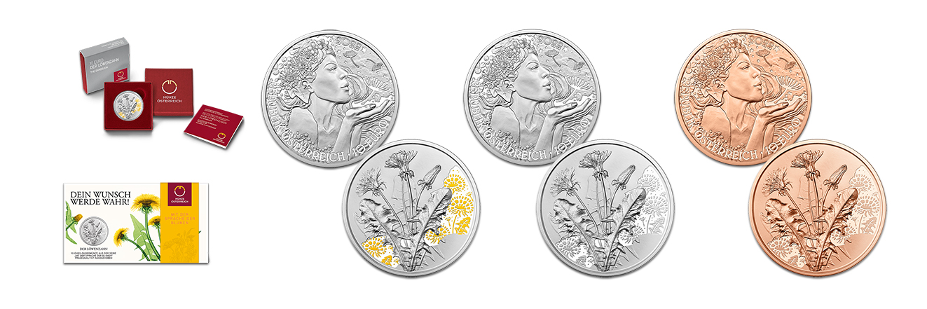 Aus der Serie mit der Sprache der Blumen veröffentlicht die Münze Österreich passend zum Frühjahr das Motiv Löwenzahn. Die Münzen stellen auf Ihrer Bildseite ein Löwenzahngewächs mit gezahnten Blättern und Blütenstängeln dar. Damit diese besonders authentisch wirken, wurden Abdrucke echter Pflanzen als Vorlage genutzt. Die Wertseite zeigt eine junge Frau mit Blumenschmuck im Haar. Sie pustet die Löwenzahnschirmchen weg. Integriert sind Ausgabeland, Prägejahr und der Nennwert über 10 Euro. Für die Gestaltung beider Seiten zeichnen die Graveure Helmut Andexlinger, Kathrin Kuntner und Rebecca Wilding verantwortlich.