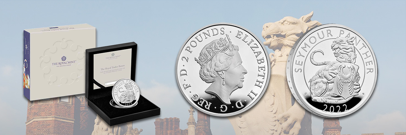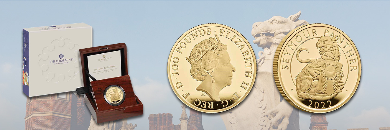 Nach dem großen Erfolg der oben genannten Münzserie bringt die Royal Mint nun eine neue 10-teilige Reihe mit heraldischen Kreaturen heraus. Die Kollektion »The Tudor Beasts« ist den Steinfiguren gewidmet, die den Eingangsbereich zum Hampton Court Palace flankieren – der bevorzugten Party-Residenz von Heinrich VIII. im Südwesten Londons. Den Auftakt bildet das 2022er-Motiv »Seymour Panther«, das von David Lawrence entworfen wurde. Die Figur repräsentiert Jane Seymour, die dritte Frau des Königs. Im Münzdesign ist das Raubtier mit aufgerissenem Maul dargestellt. In seinen Pranken hält es das Wappenschild des Herzogs von Beaufort, aus dessen Familie die Großmutter Heinrichs VIII. stammt.