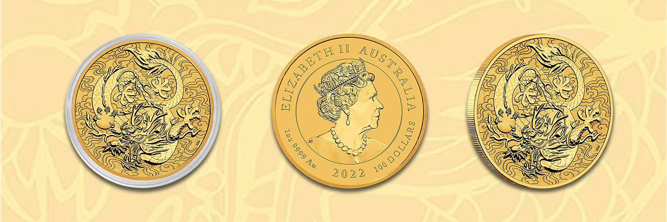Ebenfalls von der australischen Prägestätte Perth Mint stammt die Goldmünze Dragon 2022. Sie gehört zur Serie »Chinese Myths and Legends«, aus der in den vergangenen Jahren bereits die Ausgaben Dragon & Phoenix (1917, 2018), Dragon & Tiger (2019), Dragon & Dragon (2020) und Double Pixiu (2021) erschienen sind. Die Bullionmünze wird in der Einheit zu einer Feinunze mit einem Feingehalt von 999,9 Tausendstel verausgabt und hat einen Nennwert von 100 Australische Dollar. Ihr Durchmesser beläuft sich auf 32,60 Millimeter bei 2,95 Millimeter Randhöhe. Ausgegeben werden 5.000 Exemplare in Stempelglanzqualität.
