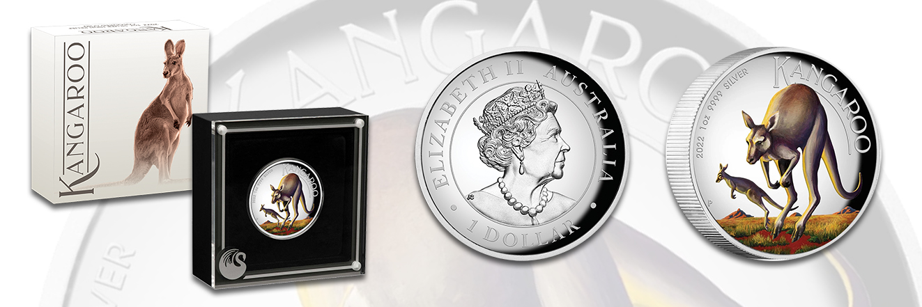 Aus der Serie Australisches Känguru erscheint die neue Hochrelief-Silbermünze zu einer Unze mit Farbprägung. Dabei übernimmt die Farbmünze das Motiv der Känguru Goldmünze von Neil Hollis mit den beiden Beuteltieren in der australischen Steppe. Bei dieser Sonderprägung sind die Kängurus und ihr Umfeld in natürlichen Farben hervorgehoben, während der restliche Münzgrund silberfarben gehalten ist. Als Umschrift erscheinen der Münzname sowie Jahrgang, Einheit und Feingehalt. Der Avers mit dem Portrait Queen Elizabeth II. und dem Nennwert über 1 Australische Dollar zeigt sich als Kontrast ohne Farbdruck.