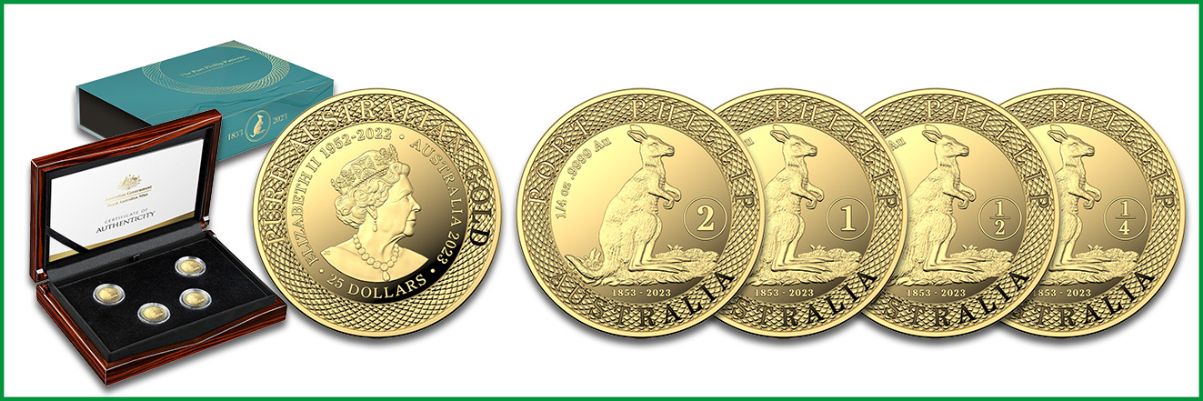 Mit einem vierteiligen Goldmünzen-Set würdigt die Royal Australian Mint die erste Investmentmünze von 1853 zu Zeiten des großen Goldrausches auf dem Fünften Kontinent. Seinerzeit wollte der britische Geschäftsmann William Taylor Goldmünzen ohne Eigenschaften als gesetzliches Zahlungsmittel herstellen. Das Projekt scheiterte bereits nach der ersten Kleinstauflage aufgrund drastisch gestiegener Goldpreise. Das neue Set ist den ursprünglichen Münzen nachempfunden mit Rückseiten, die ein sitzendes Känguru zeigen. Die Vorderseiten bilden das Memorial-Portrait von Queen Elizabeth II. nach Jody Clark ab. Beide Münzseiten ziert ein Ring mit dem charakteristischen Kreuzschraffur-Muster, das von Taylor entworfen wurde.